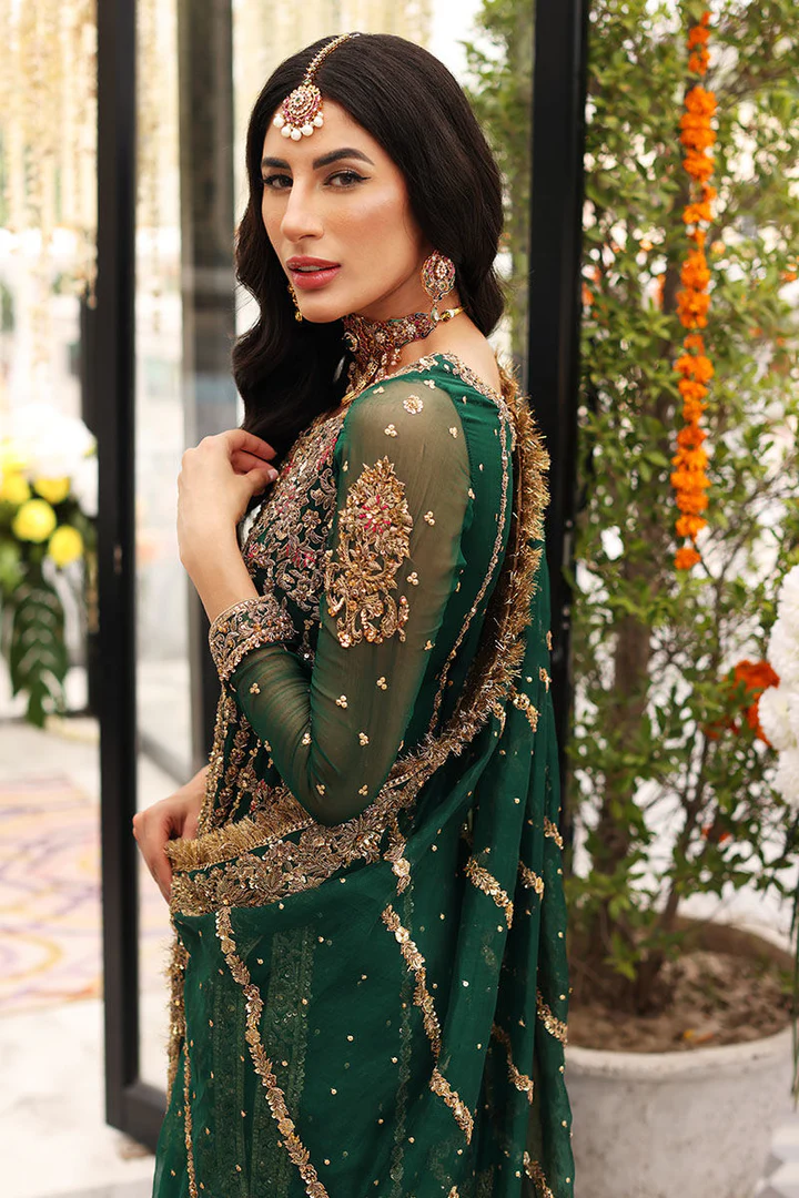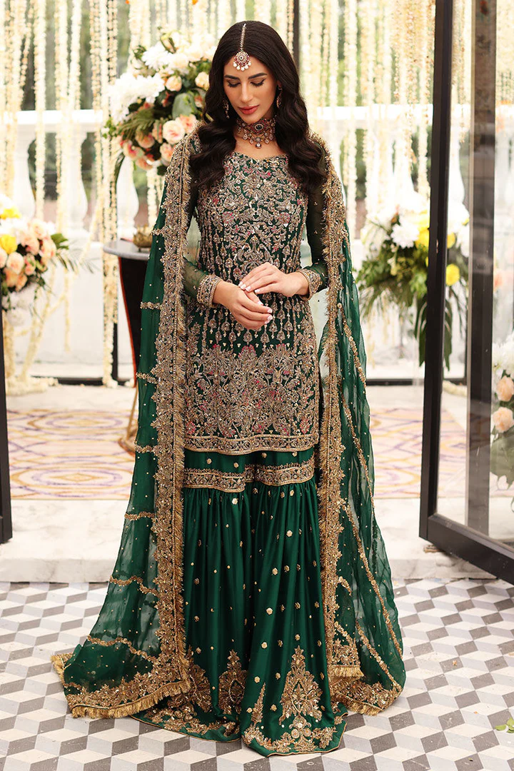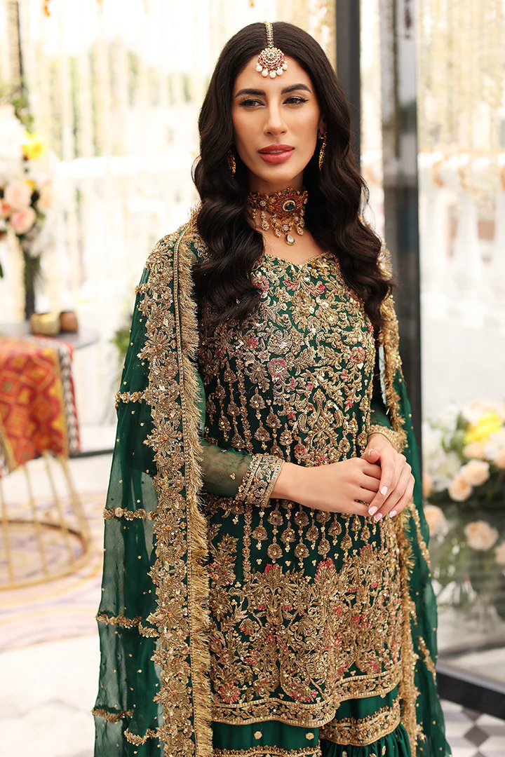 Dark Green Gharara Shirt: Bride love is in the air! NameerabyFarooq presents a dark green shirt rendered with golden embroidery and is enhanced with the magic of Resham, pearls, Sitara, tilla and dabka to complete the feeling of your reception day. The shirt is emphasized with boat shape neckline and full net chiffon sleeves to make your day super romantic.