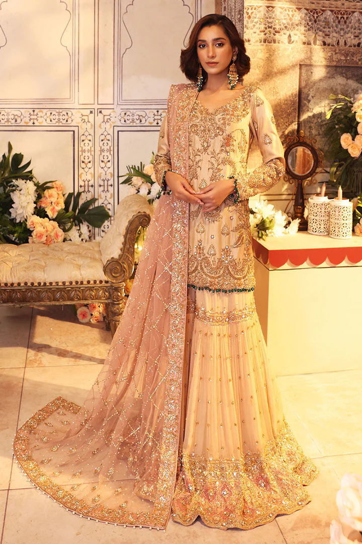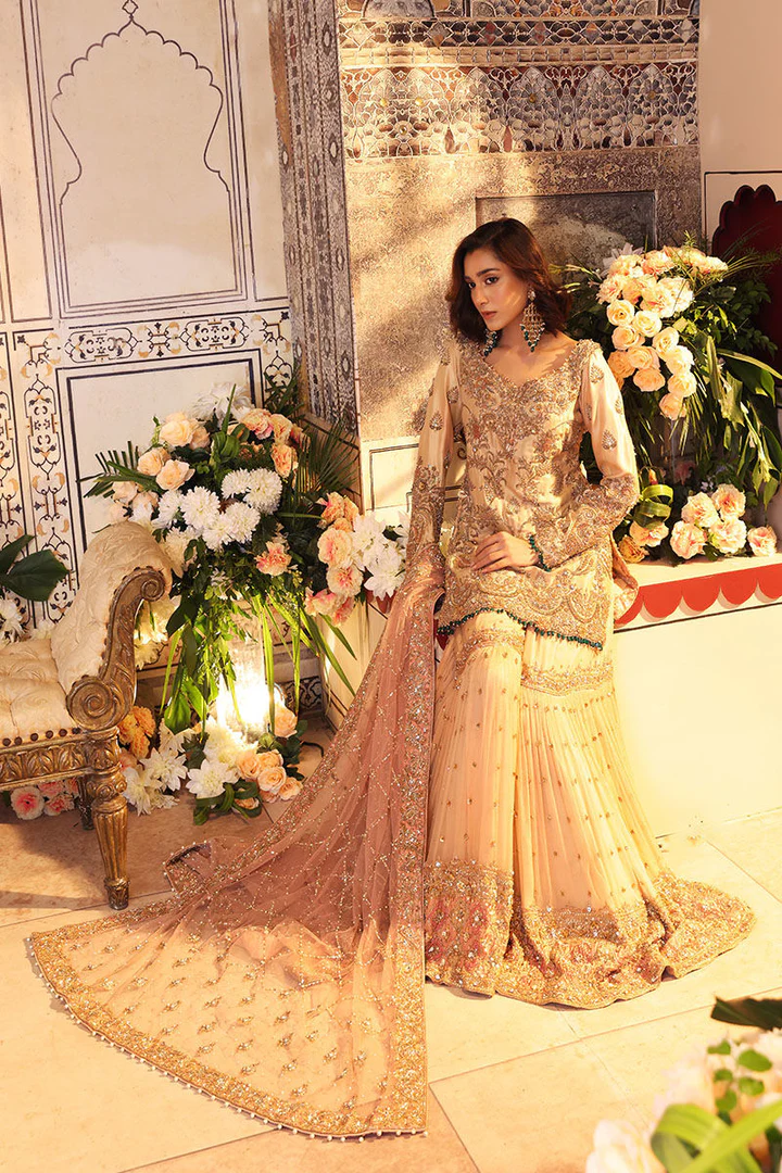 Gharara: The embellished kameez is paired with gharara to create an exquisite Pakistani Bridal Dress. Gharara comes in premium chiffon fabric. Chatta patti and embellished borders make this Gharara Dress a perfect choice to wear o the wedding day.