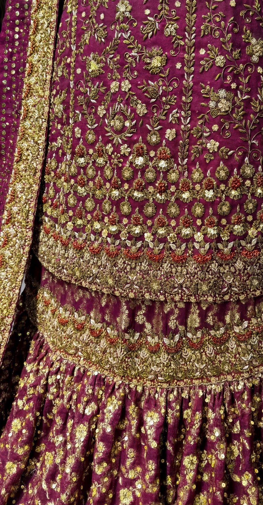 • Classic Farshi lehenga silhouette enhanced with fine handcrafted detailing